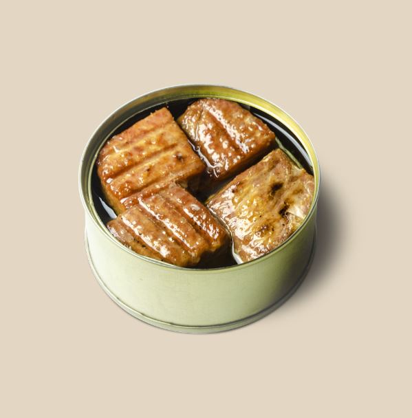 Wilde Almadraba rode tonijn. Hoge kwaliteit descargamento, het stuk onder de lomo blanco, tegen de graat. Geroosterd met houtvan steeneik en geconserveerd in Arbequiña de Castillo Canene extra vierge olijfolie.